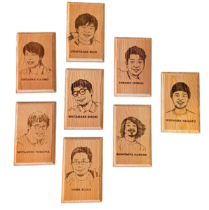 送っていただいた顔写真を木札に焼き込んでHIGASAに展示させていただきます。